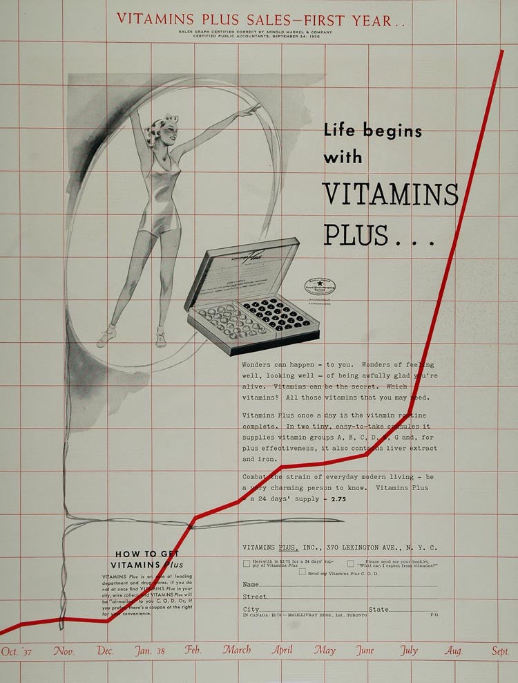 This is an original 1938 color print ad for Vitamins Plus Capsules with Vitamins A, B, C, D, E, G and liver extract and iron from Vitamins Plus, Inc., 370 Lexington Ave., New York City. The ad has an interesting graph of the Vitamin Plus sales for their first year.