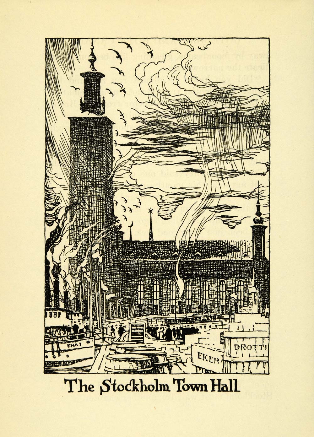 1938 Wood Engraving Stockholm Sweden City Hall Oakley Sverige Stadshus Art XGG1