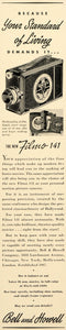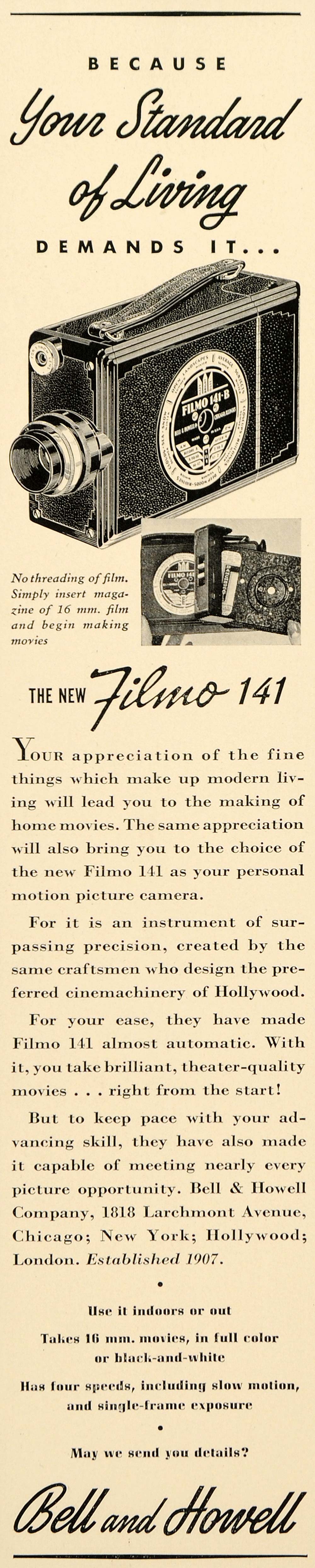 This is an original 1939 black and white print ad for the Filmo 141 camera from Bell & Howell Company located at 1818 Larchmont Avenue, Chicago.