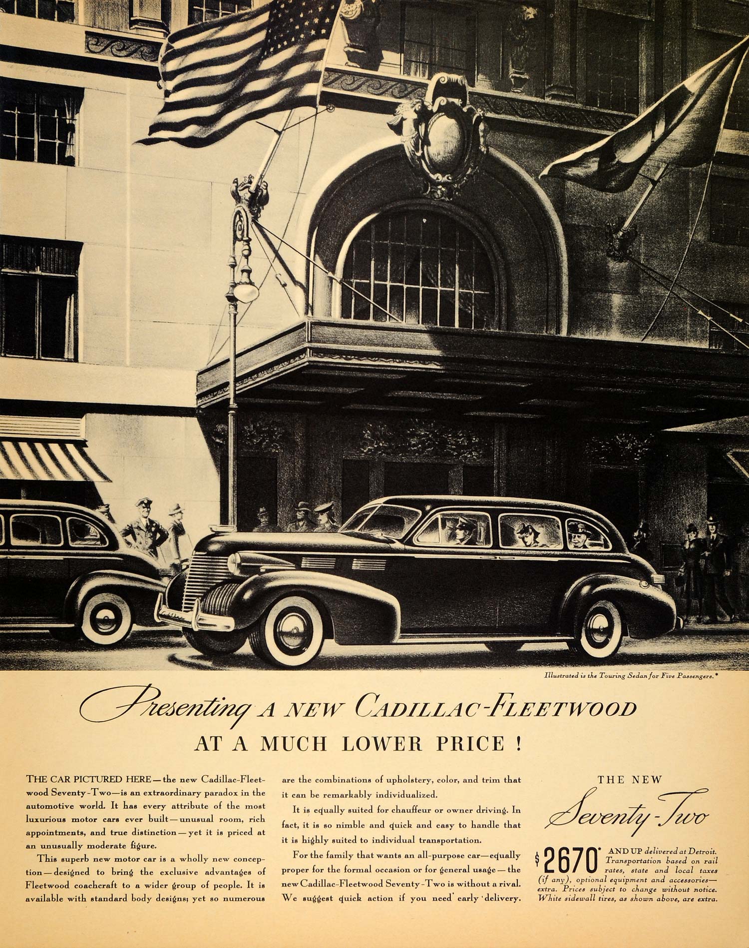 This is an original 1939 black and white print ad for the Cadillac-Fleetwood Seventy-Two Model Vehicle, delivered to Detroit. The illustration is of the Touring Sedan for five passengers. This vehicle is parked in front of the building that we think is the Plaza Hotel.