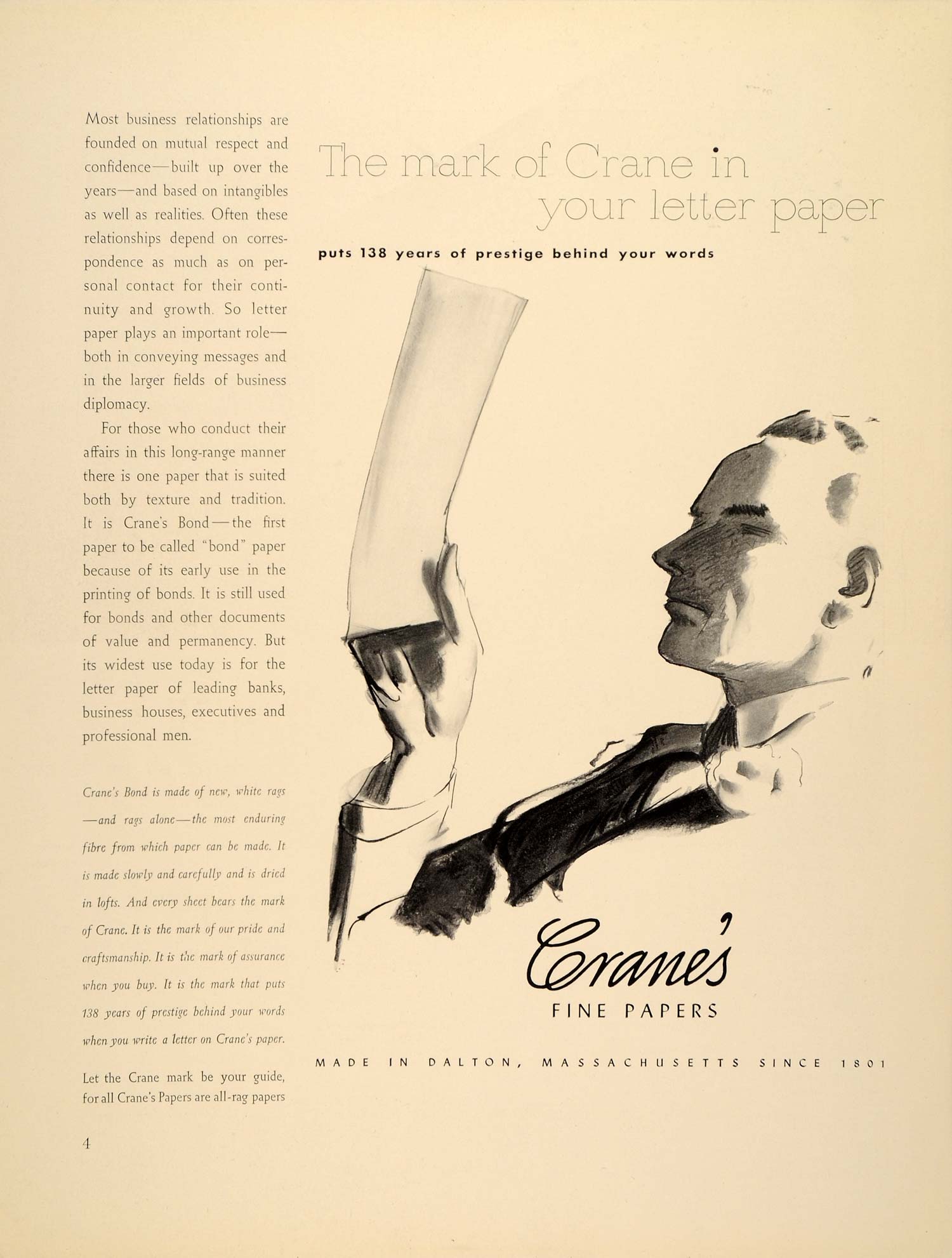 Keywords specific to this image: paper, letters, all-rag, bond, professional, write, writer, writing, lettering, Crane's Bond, sheet, letter, documents, message Vintage Advertising