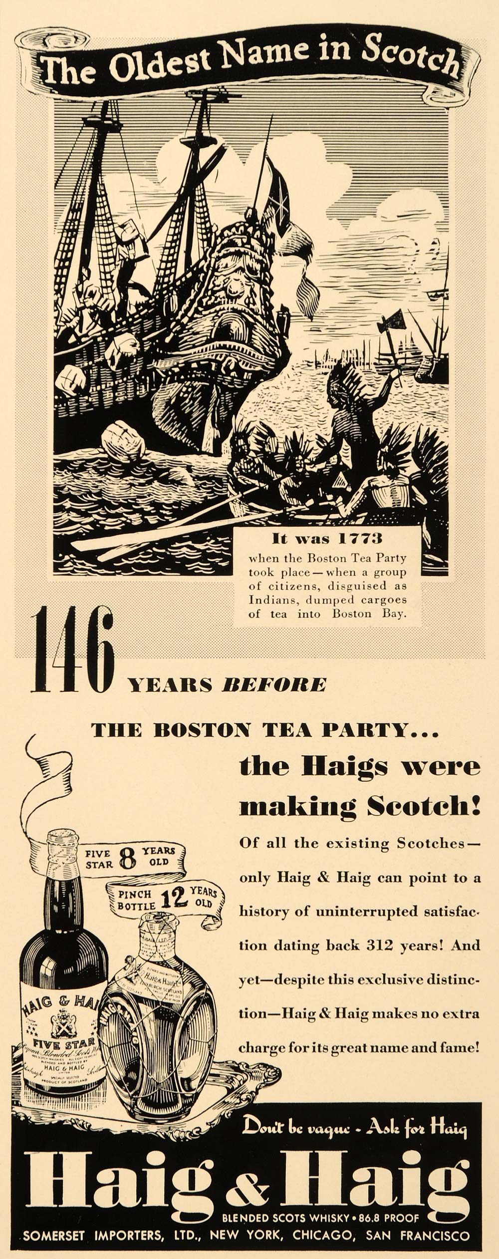 This is an original 1939 black and white print ad for Haig and Haig Blended Scots Whisky. The ad says, "It was 1773 when the Boston Tea Party took place-- when a group of citizens, disguised as Indians, dumped caroes of tea into Boston Bay".