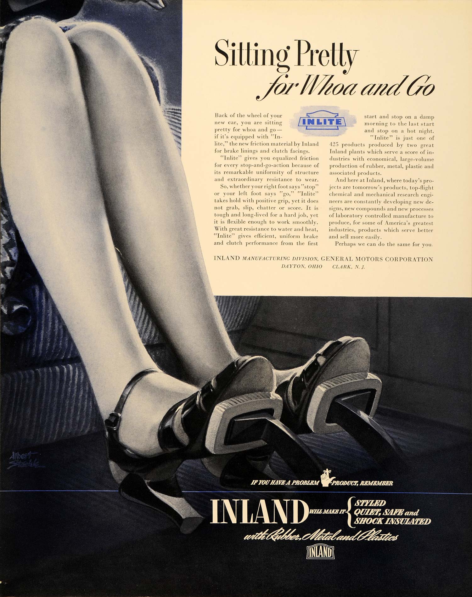 This is an original 1939 color print ad for Inlite by Inland with rubber, metal, and plastics, a division of General Motors Corporation. Dayton, Ohio and Clark, New Jersey.