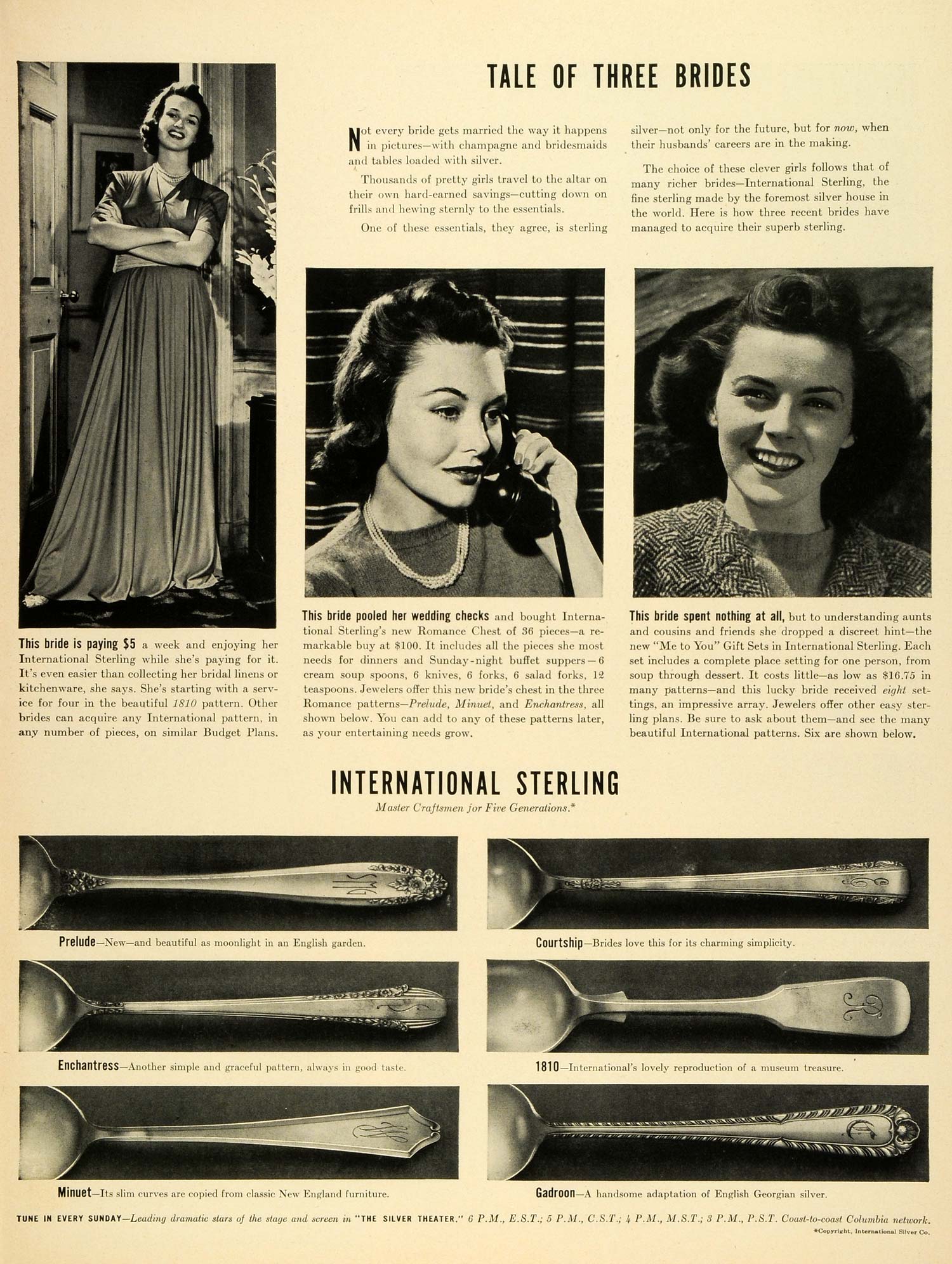 This is an original 1939 black and white print ad for the International Sterling promoting the Prelude, Courtship, Enchantress, 1810, Minuet, and Gadroon spoon designs from International Silver Company.