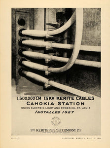 This ad features an image of the 1,500,000 CM 15kv Kerite Cables installed in the Cahokia Station of the Union Electric Light and Power Company located in Saint Louis, Missouri.