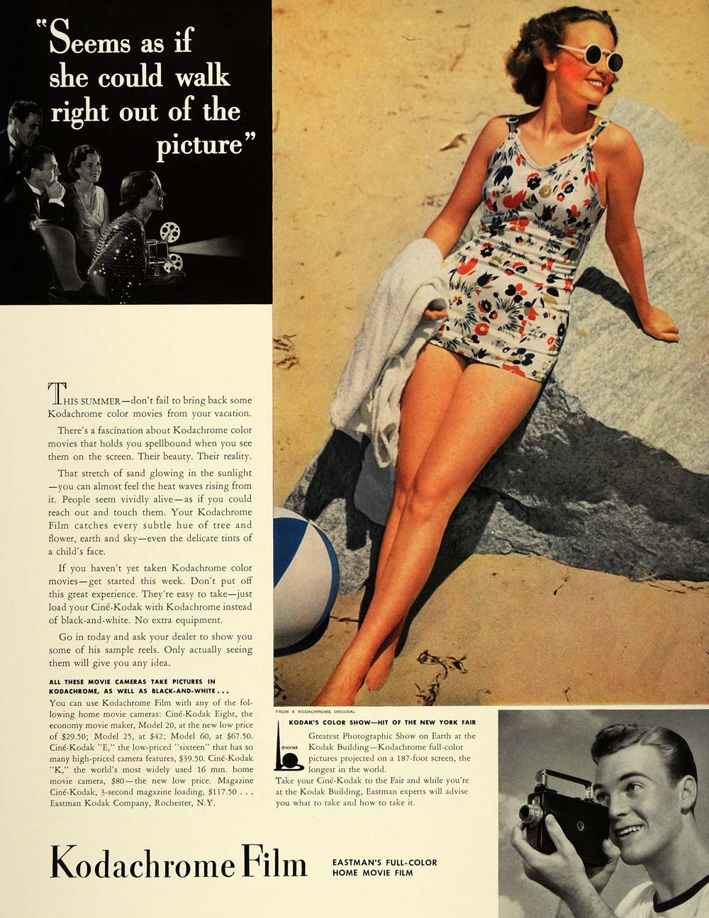 This is an original 1939 color print ad for Kodachrome Film for color home movies from the Eastman Kodak Company of Rochester, NY.