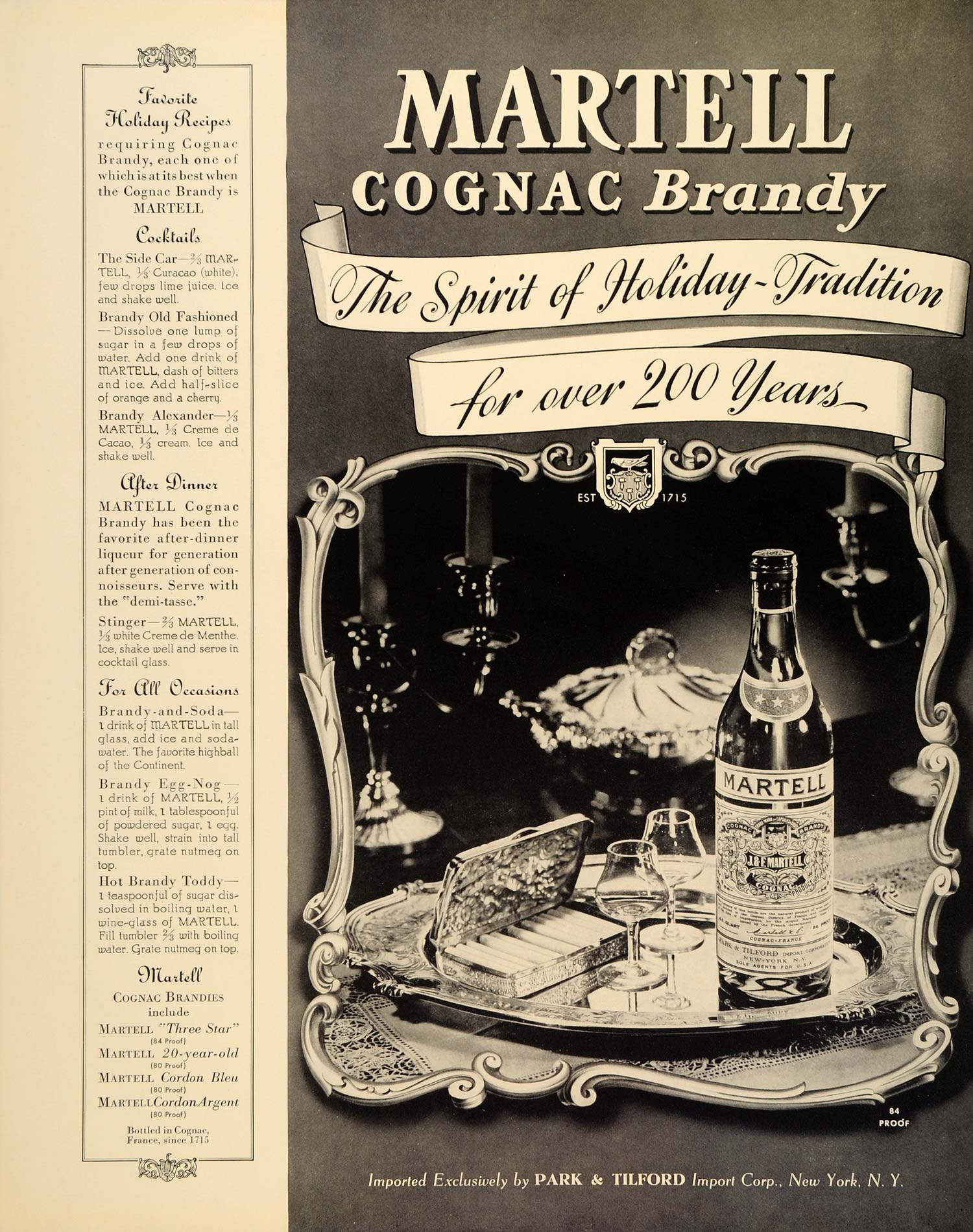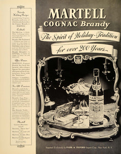 This is an original 1939 black and white print ad for Martell Cognac Brandy, "the spirit of Holiday Tradition for over 200 years." A bottle of Martell sits on a silver platter with two glasses and a fancy cigarette case-- awaiting after-dinner enjoyment. Several cocktail recipes are featured: The Side Car, Brandy Old Fashioned, Brandy Alexander, Stinger, Eggnog, and Hot Toddy.