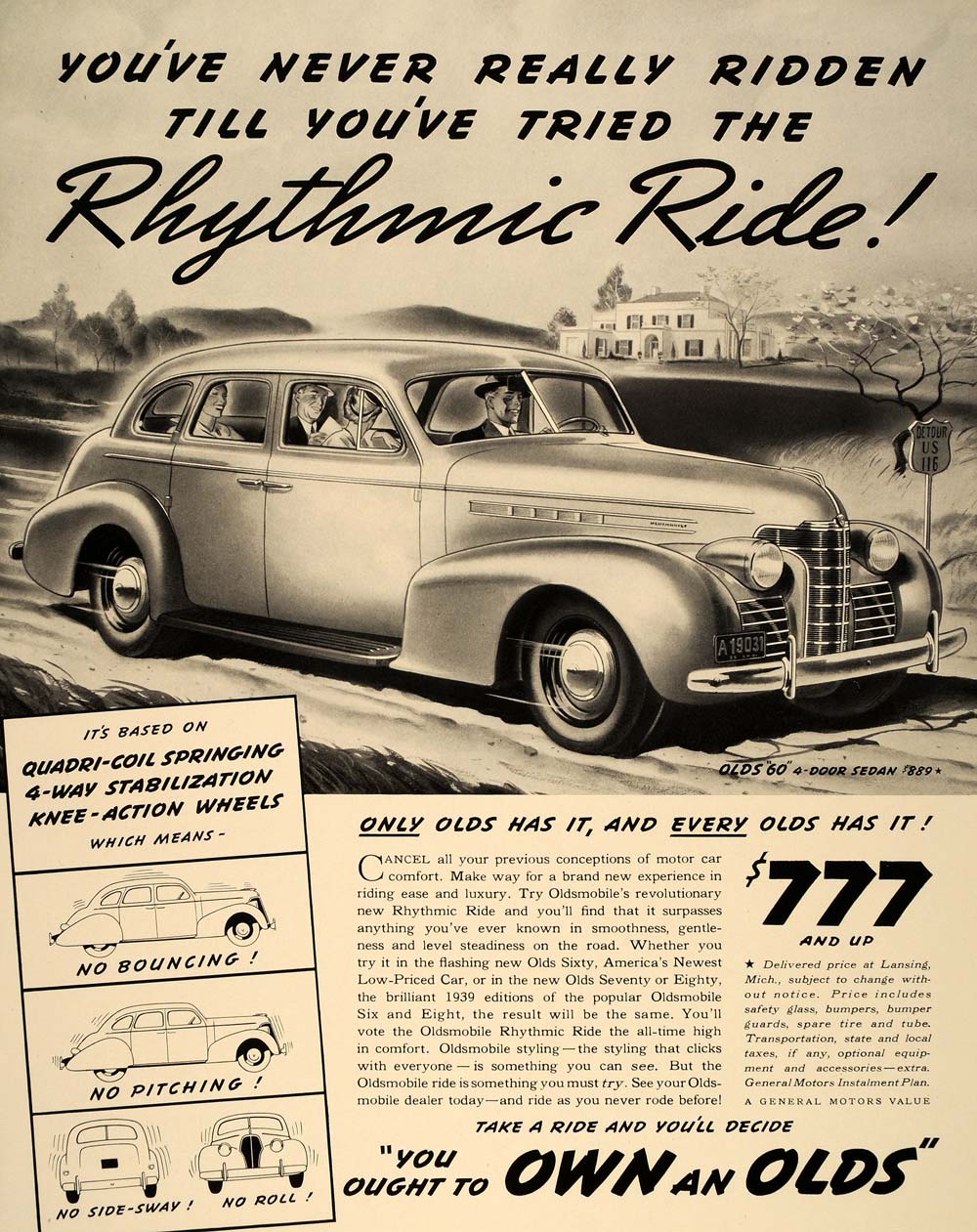 This is an original 1939 black and white print ad for the Oldsmobile "60" 4-Door Sedan ($777).