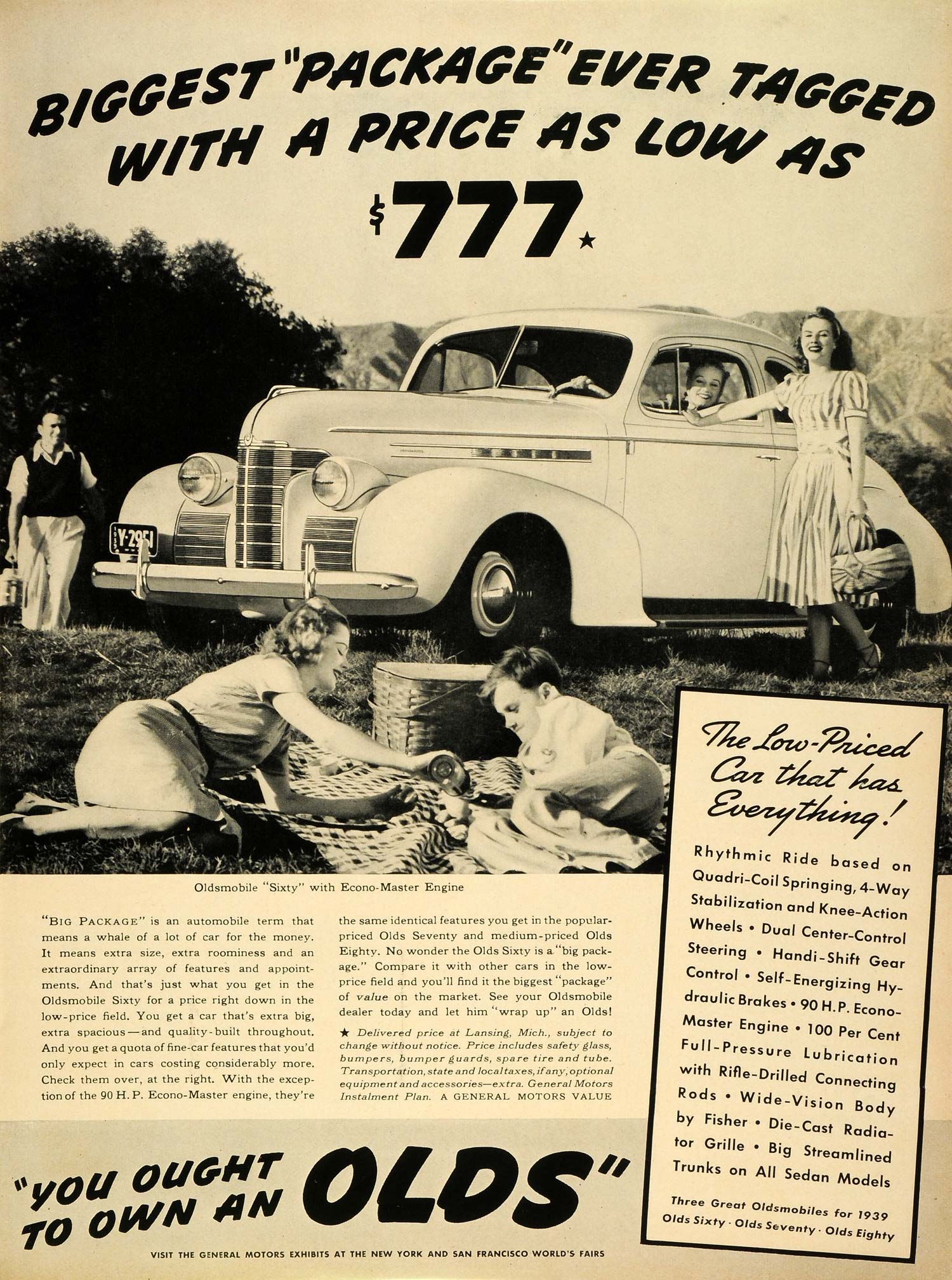 This is an original 1939 black and white print ad for the Oldsmobile Sixty with Econo-Master Engine, a product line by General Motors.