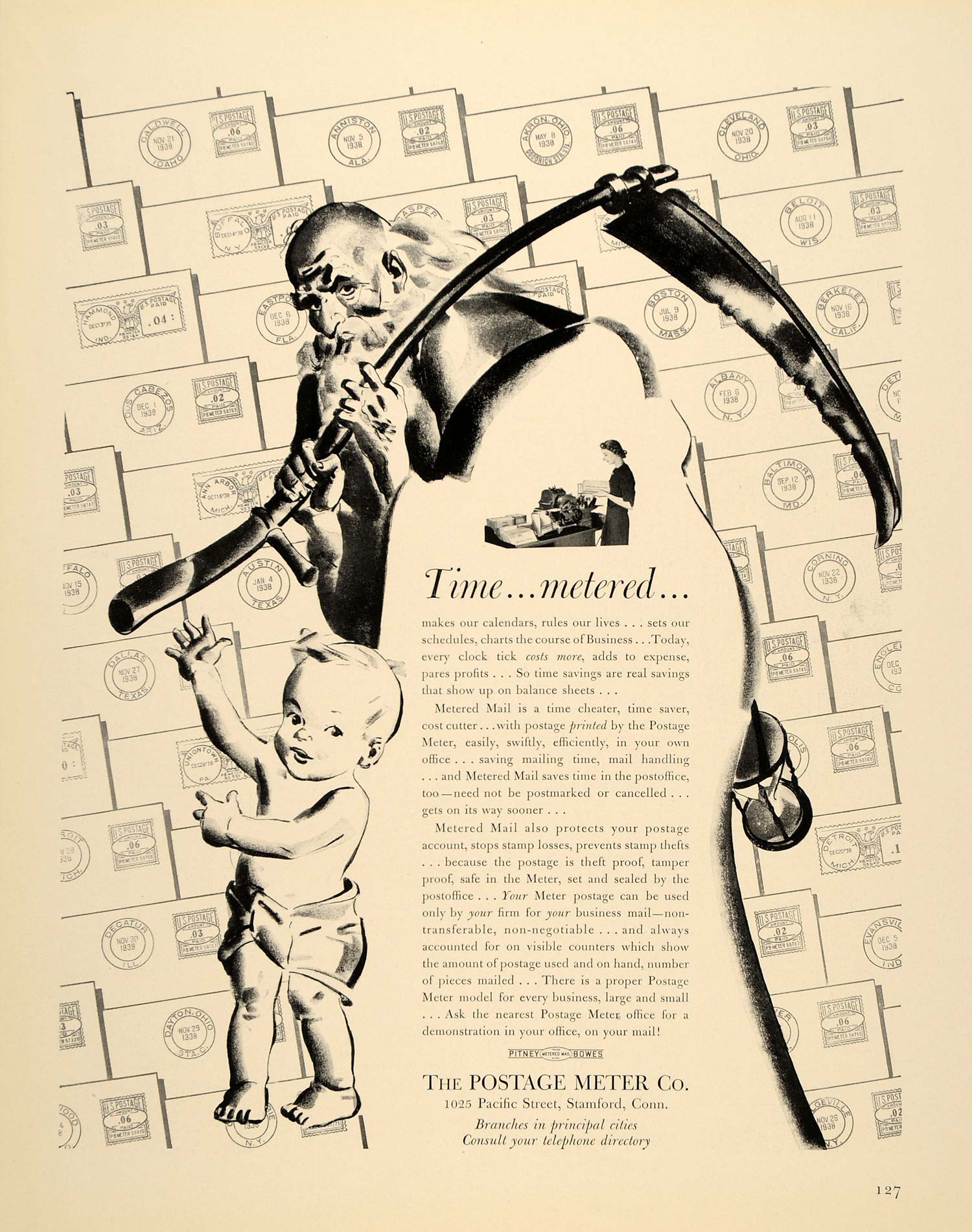 This is an original 1939 black and white print ad for The Postage Meter Company.
