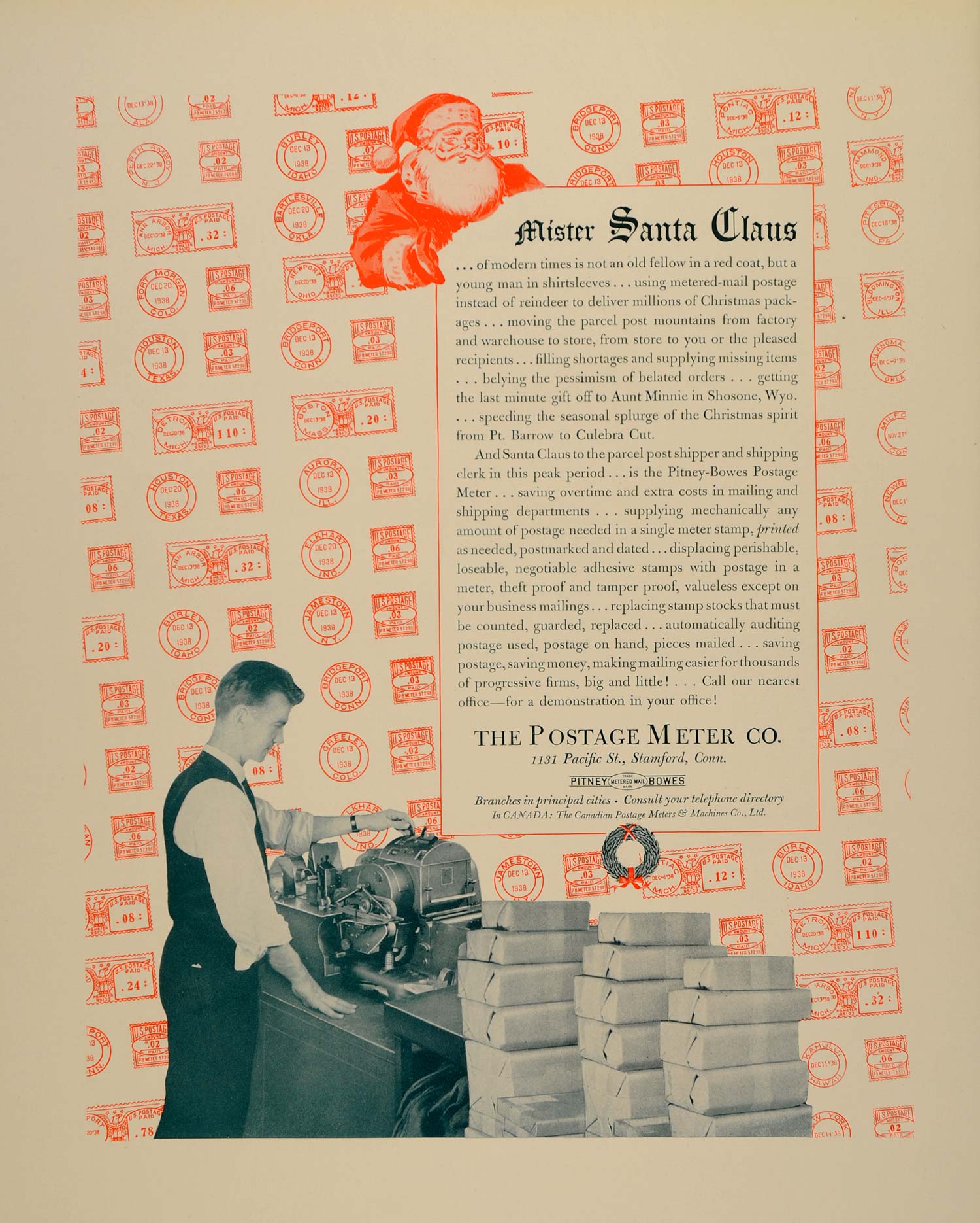 This is an original 1939 color print ad for The Postage Meter Company, 1131 Pacific Street, Stamford, Connecticut. (Pitney Bowes) The modern Santa Claus-- delivering millions of Christmas gifts.