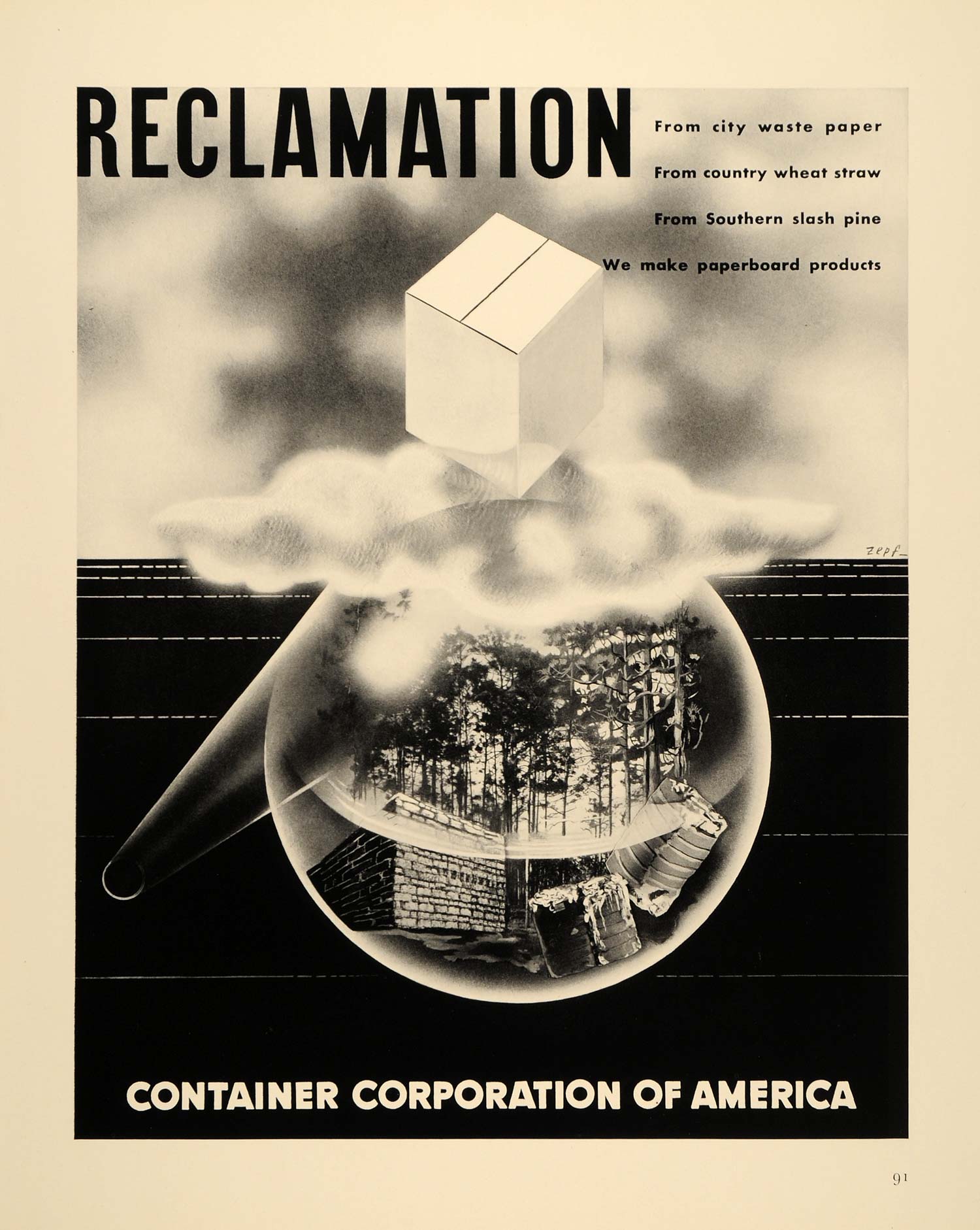 This is an original 1939 black and white print ad for the Container Corporation of America, makers of paperboard products from reclaimed city waste paper, country wheat straw, and Southern slash pine.