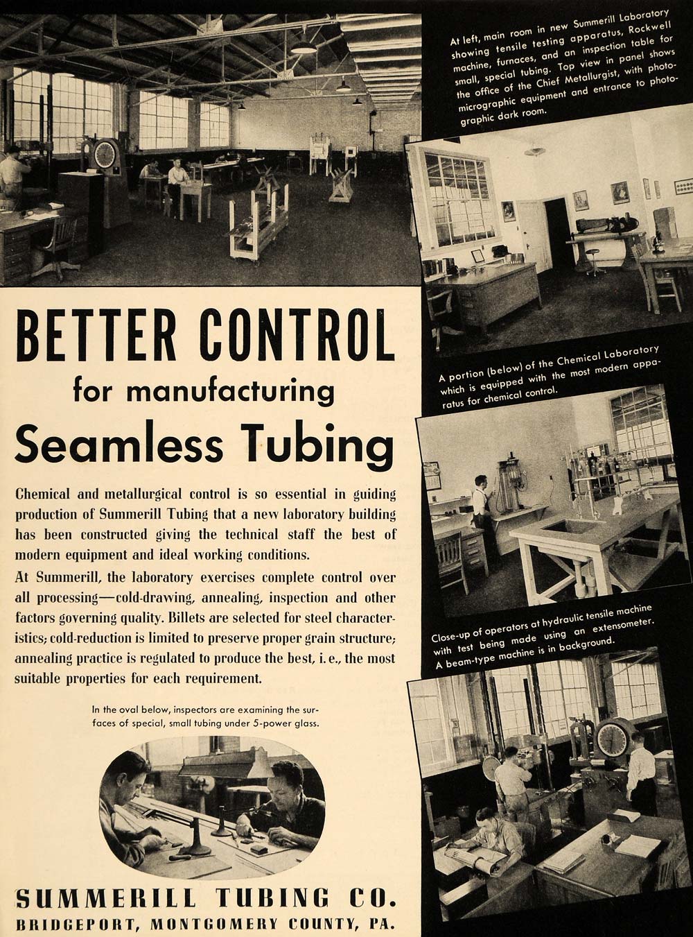 This is an original 1939 black and white print ad for seamless tubing by Summerill Tubing Company located in Bridgeport, Montgomery County, Pennsylvania.