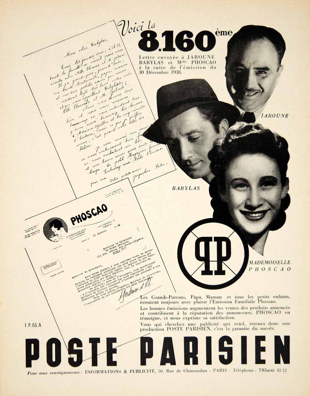 This is an original 1939 black and white French print ad for Poste Parisien, the French radio station.