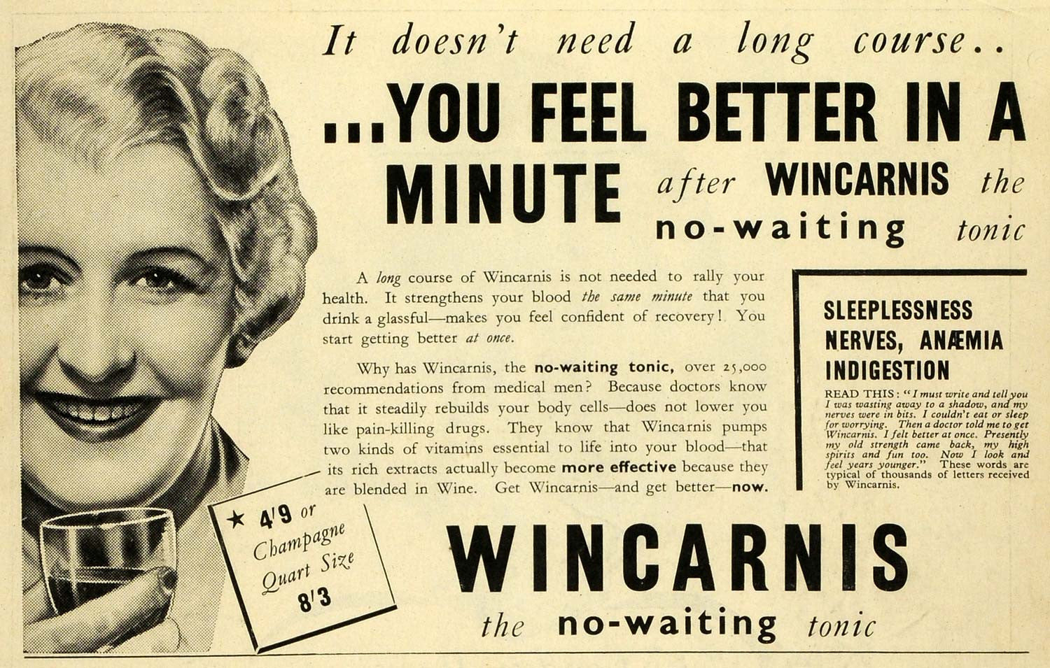 This is an original 1939 black and white print ad for the Wincarnis, the non-waiting tonic for indigestion, anemia, and sleeplessness.