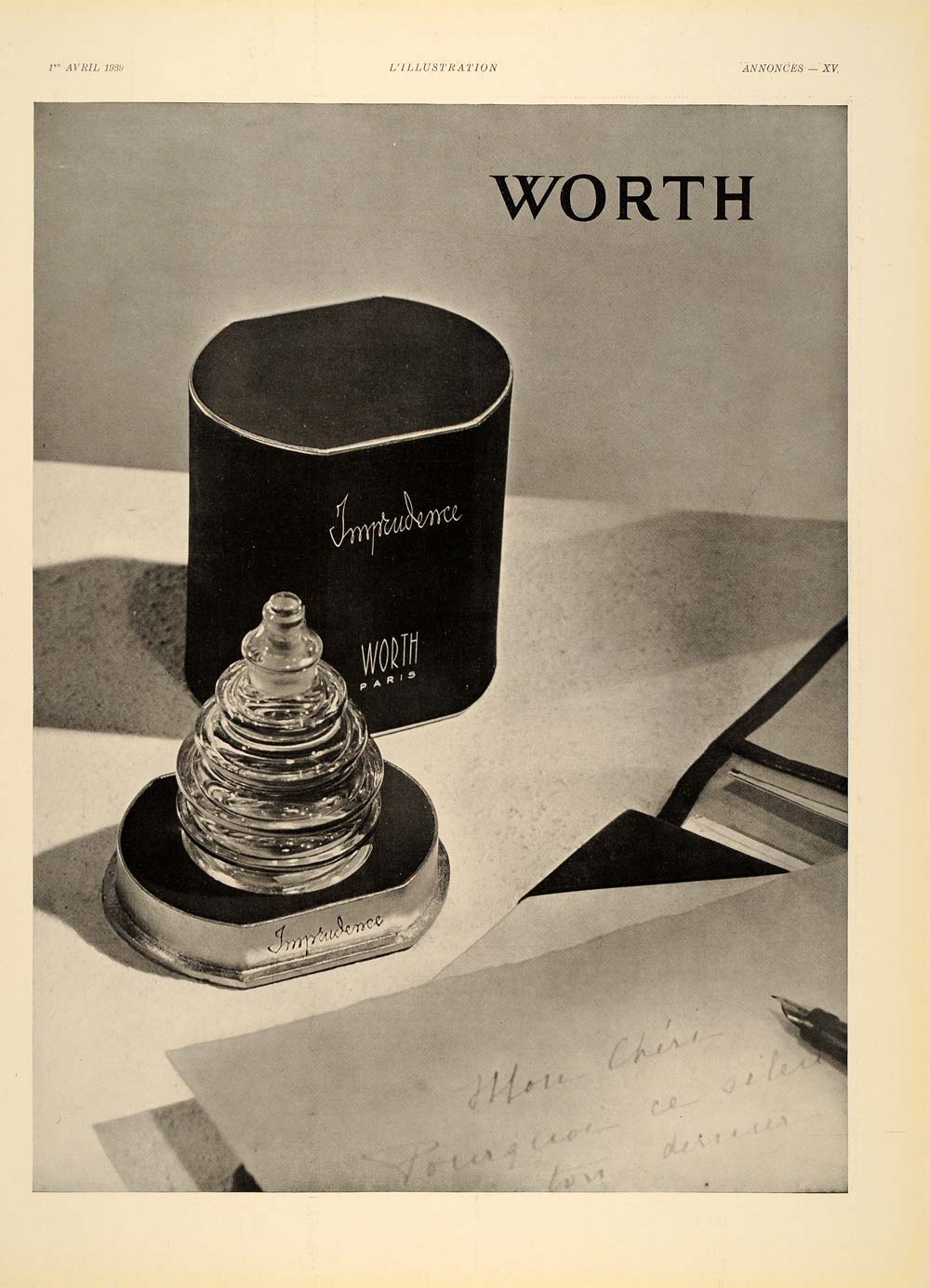 This is an original 1939 black and white French print ad for the perfume "Imprudence" by Worth of Paris.