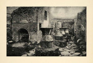 This is an original 1939 black and white halftone print of a bakery unearthed in the buried city of Pompeii.