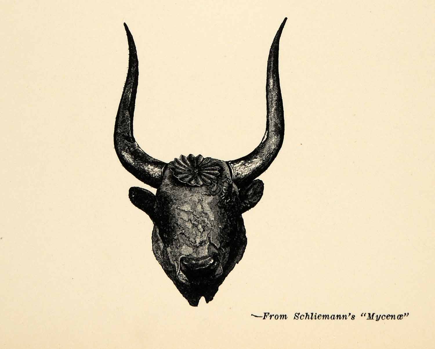 This is an original 1939 black and white halftone print of an ox head that was interred at the tomb of the king in Mycenae, Greece on the Acropolis. The head is a symbol of the sacrifices made to the king; the snout horns and rosette are gilded in gold.
