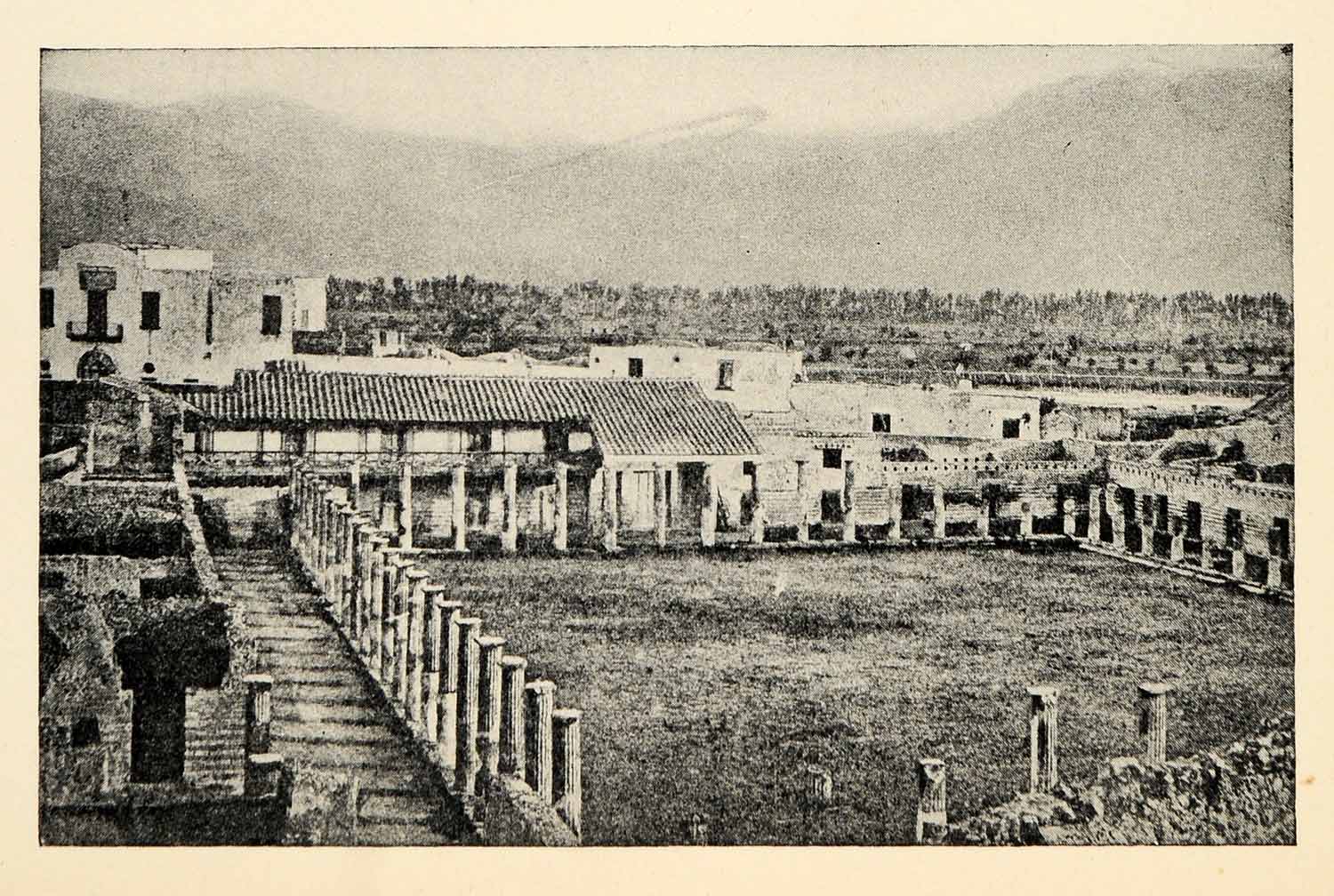 This is an original 1939 black and white halftone print of Schola Armatorum (School of the Gladiators) in the buried city of Pompeii of the Roman Empire. In 2010 this structure collapsed due to high amounts of rain and "water infiltration."