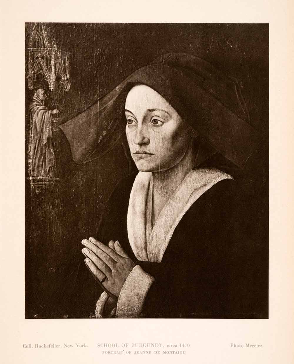 This is an original 1939 black and white photogravure that portrays Jeanne de Montaigu. It was originally painted by a French artist from the School of Burgundy circa 1470, and was eventually acquired for the Rochefeller Collection in New York.