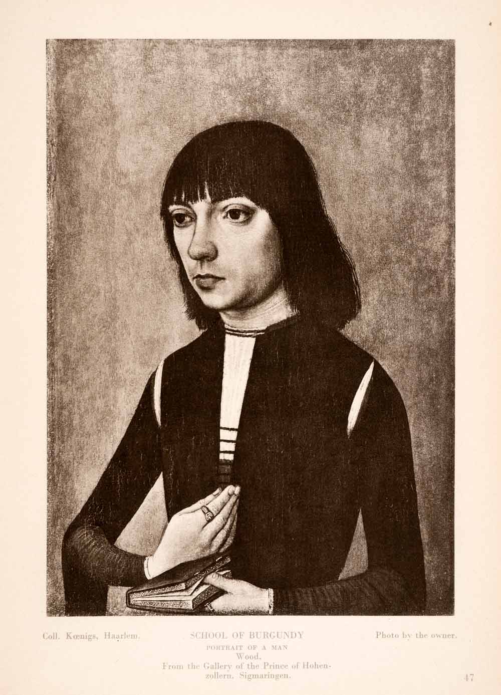This is an original 1939 black and white photogravure of an unknown man. It was originally painted by an artist from the school of Burgundy during the late Middle Ages/early Renaissance.