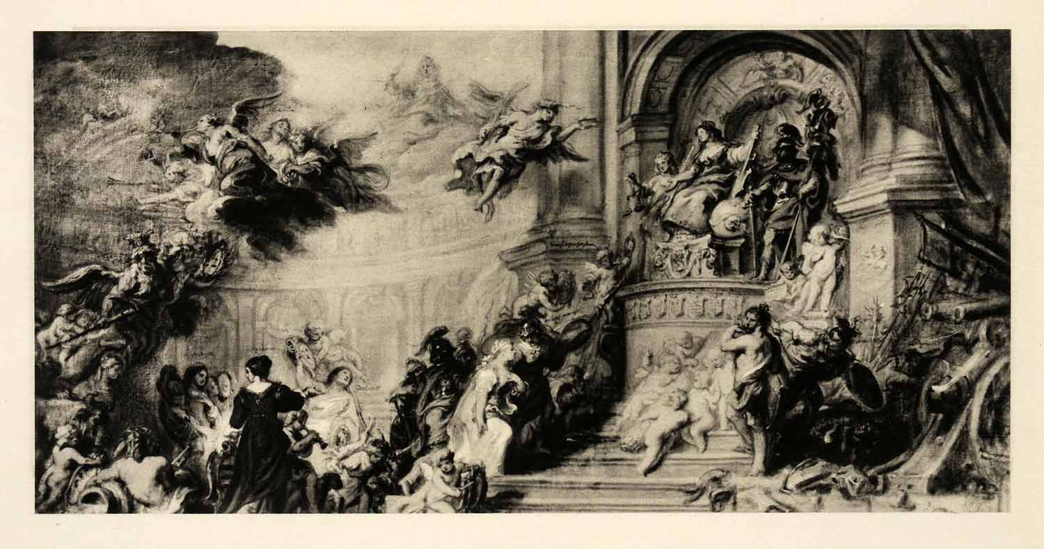This is an original 1939 black and white photogravure of a painting titled "Allegory of the Union of the Netherlands."