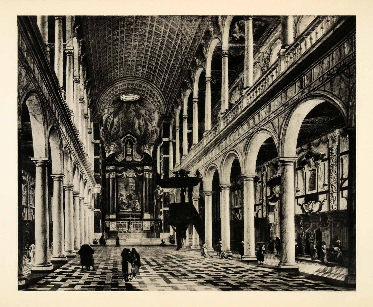 This is an original 1939 black and white photogravure of a painting titled "Interior of the Jesuit Church at Antwerp."
