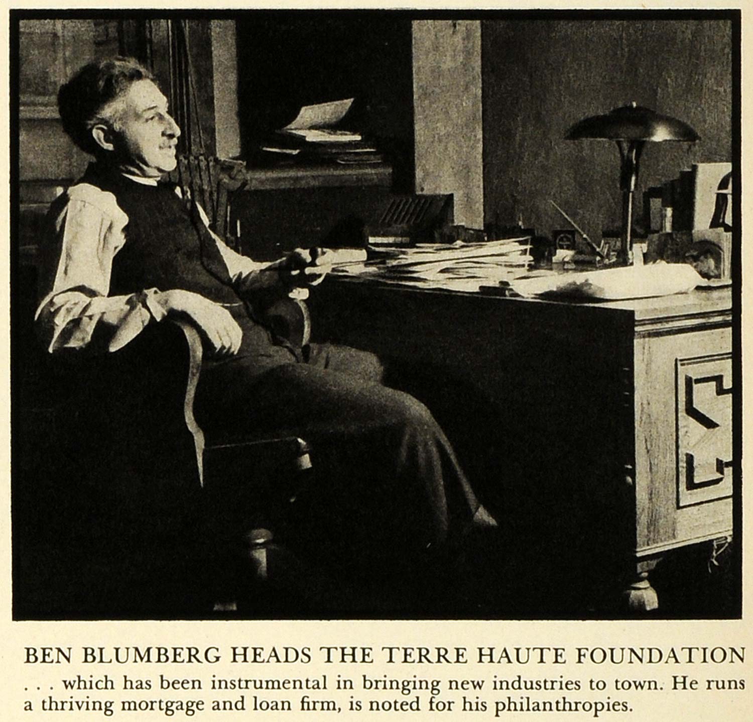 This is an original 1939 halftone print of Benjamin Blumberg. The caption writes, "Ben Blumberg heads the Terre Haute Foundation which has been instrumental in bringing new industries to town." Blumberg married his wife Fannie in 1916, and during World War II, took in two Jewish children from Europe to protect them from the Third Reich.