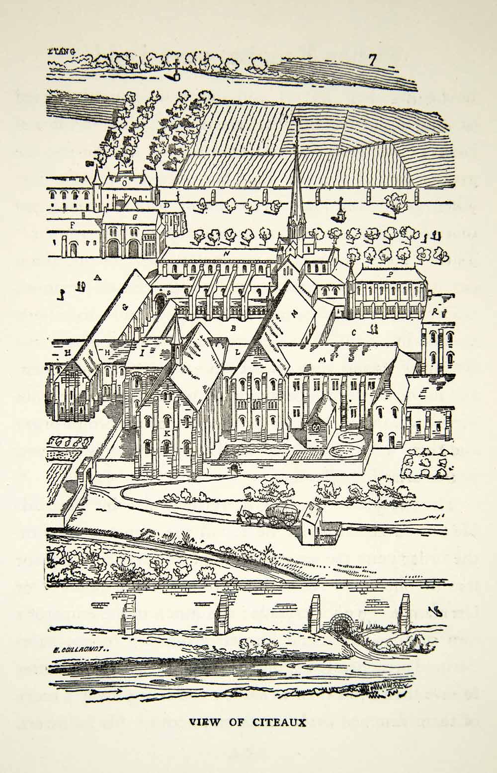 This is an original 1939 black and white relief line-block print of a cityscape of Citeaux, located in France.