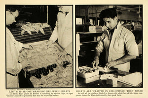 This is an original 1939 halftone print of men working at the Birds Eye plant in Boston, Massachusetts. The caption writes, "Last step before wrapping red-perch fillets at Birds Eye's plant in Boston is candling by electric light to spot 'blisters' (caused by parasites) that may be below the surface." The company is currently owned by Pinnacle Foods, and is credited with the fast freezing process. Photography by Richard Carver Wood.