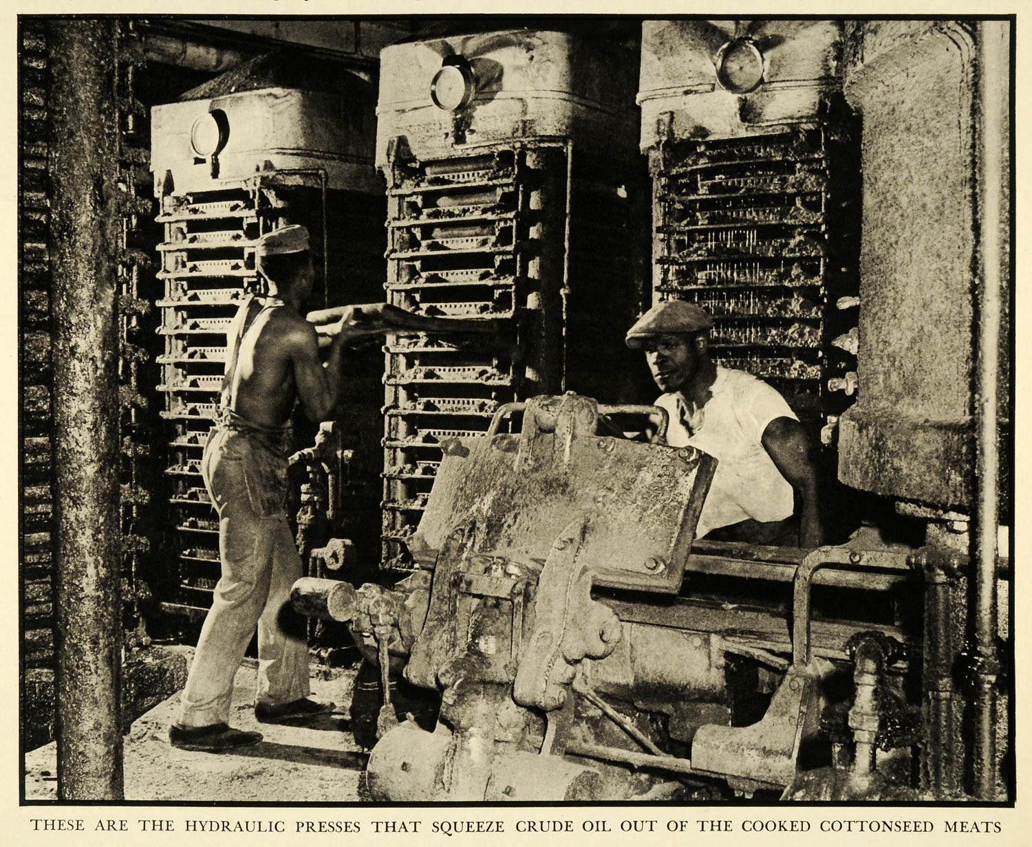 This is an original 1939 halftone print of Wesson's hydraulic presses that squeeze cottonseed meats to produce crude oil. The president of the company at the time was A. D. Geoghegan and vice president A. Q. Petersen.