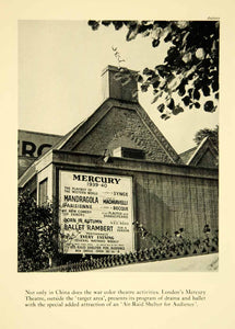 This is an original 1939 black and white halftone print of a playbill poster outside London's Mercury Theatre advertising the theatre's productions with the added attraction of an "Air-Raid Shelter for the Audience."