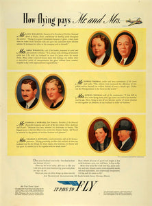 This is an original 1940 color print ad for the Air Transport Association located at 135 South La Salle Street, Chicago, Illinois. This ad features images of Mrs. and Mr. Lang Wharton, an Executive Vice-president of the First National Bank of Dallas, Texas; Mrs. and Mr. Lowell Thomas, the author and news-commentator of the screen and radio; Mr. and Mrs. Charles S. Howard, the president of the Howard Automobile Company and owner of the two famous horses, Seabiscuit and Kayak.