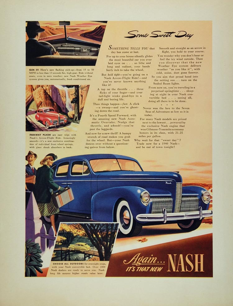 This is an original 1940 color print ad for Nash Arrow-Flight automobiles, with convertible bed and automatic "Weather Eye."