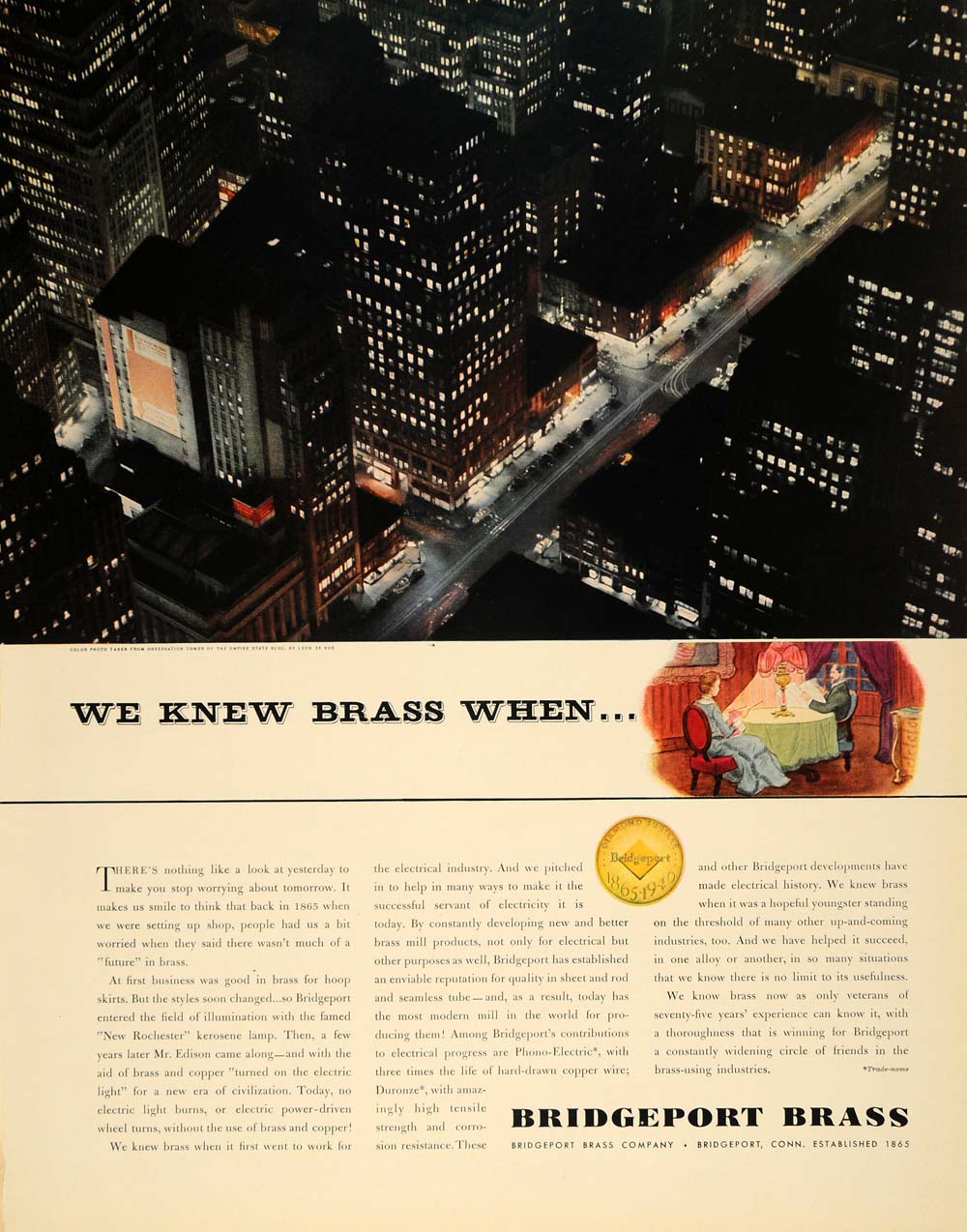 This is a stunning original 1940 color print ad for the Bridgeport Brass Company, located in Bridgeport, Connecticut. This ad features an image taken from the observation tower of the Empire State Building by Leon De Vos.