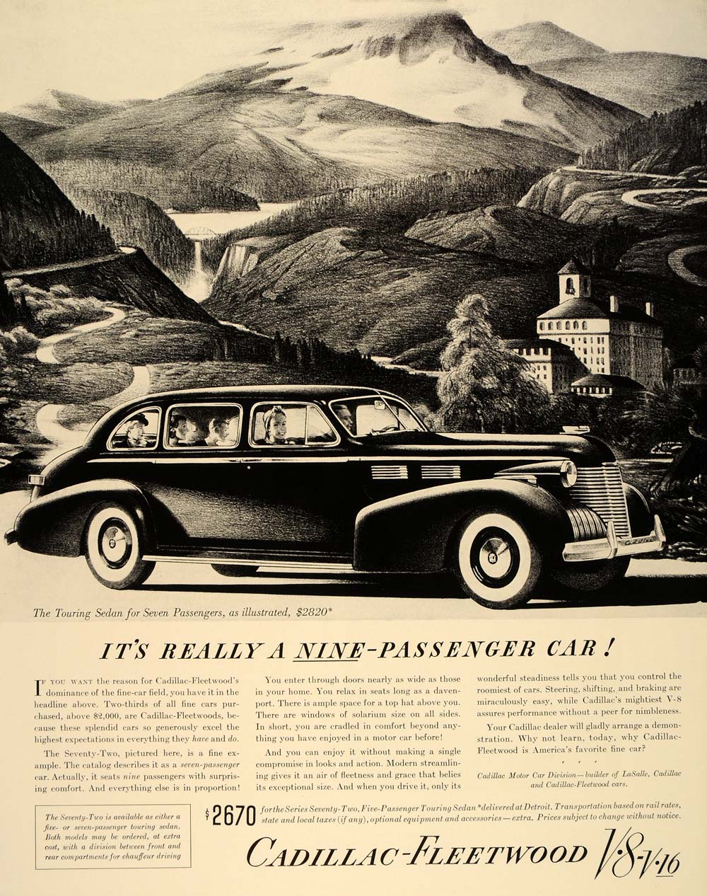This is an original 1940 black and white print ad for the Cadillac-Fleetwood Seventy-Two Touring Sedan for seven passengers ($2820). This is an excellent original print item for the collector of this vintage luxury car!