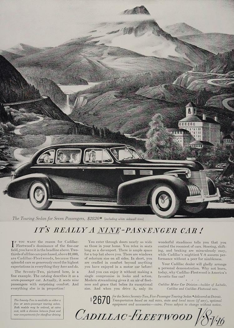 This is an original 1940 black and white print ad for the Cadillac-Fleetwood Seventy-Two luxury automobile. Shown here is the Touring Sedan for seven passengers for $2820 (including white sidewall tires).
