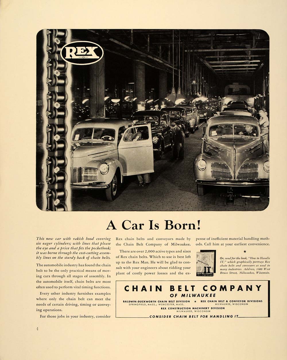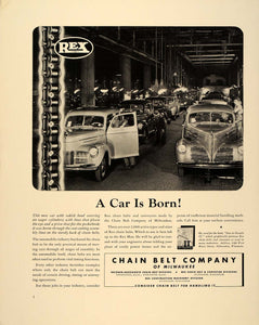 This is an original 1940 black and white print ad for Rex chain belts and conveyors from the Chain Belt Company of Milwaukee.