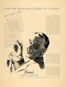 This is an original 1940 black and white print ad for Crane's Fine Papers of Dalton, Massachusetts, featuring a letter from The Whately Manufacturing Company (R. P. Clayton), addressed to H. T. Barley.