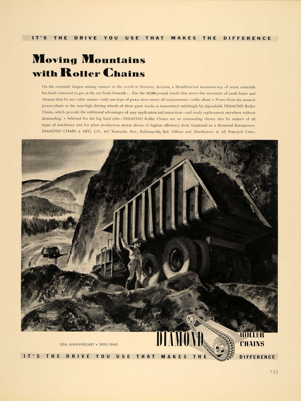 This is an original 1940 black and white print ad for Diamond Chain & Manufacturing Company, located at 467 Kentucky Avenue in Indianapolis, Indiana. This ad features the company's Diamond Roller Chains. This advertisement has artwork by the artist Raymon Naylor.