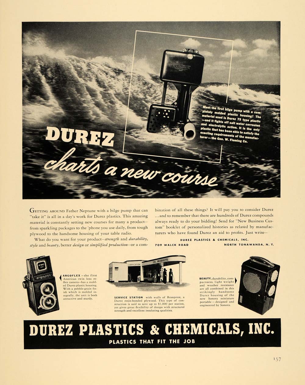 This is an original 1940 black and white print ad for Durez Plastics and Cheimcals.