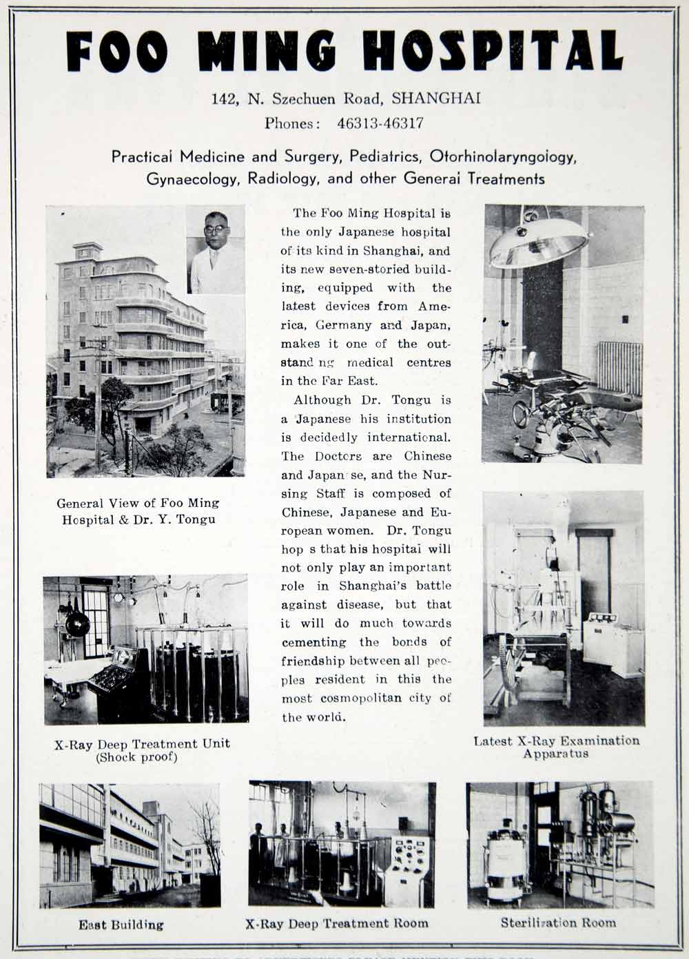 This is an original 1940 black and white print ad for the Foo Ming Hospital, a Japanese hospital at 142 N. Szechuen Road, Shanghai, China under the direction of Dr. Y. Tongu.