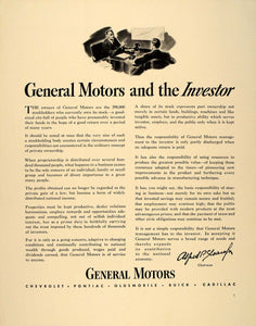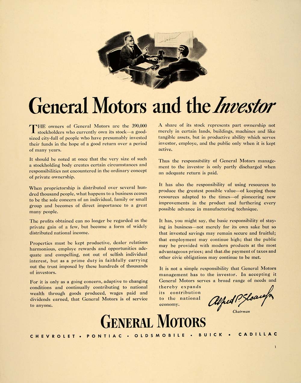 This is an original 1940 black and white print ad for General Motors with a message from GM Chairman, Alfred P. Sloan, Jr.