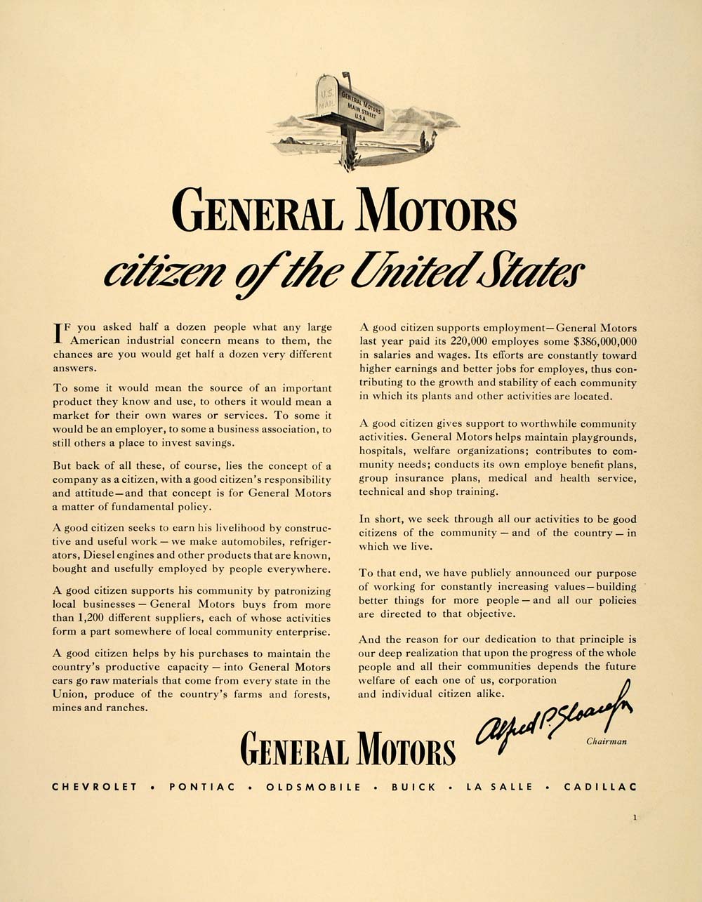 This is an original 1940 black and white print ad for General Motors with a message from GM Chairman, Alfred P. Sloan, Jr.