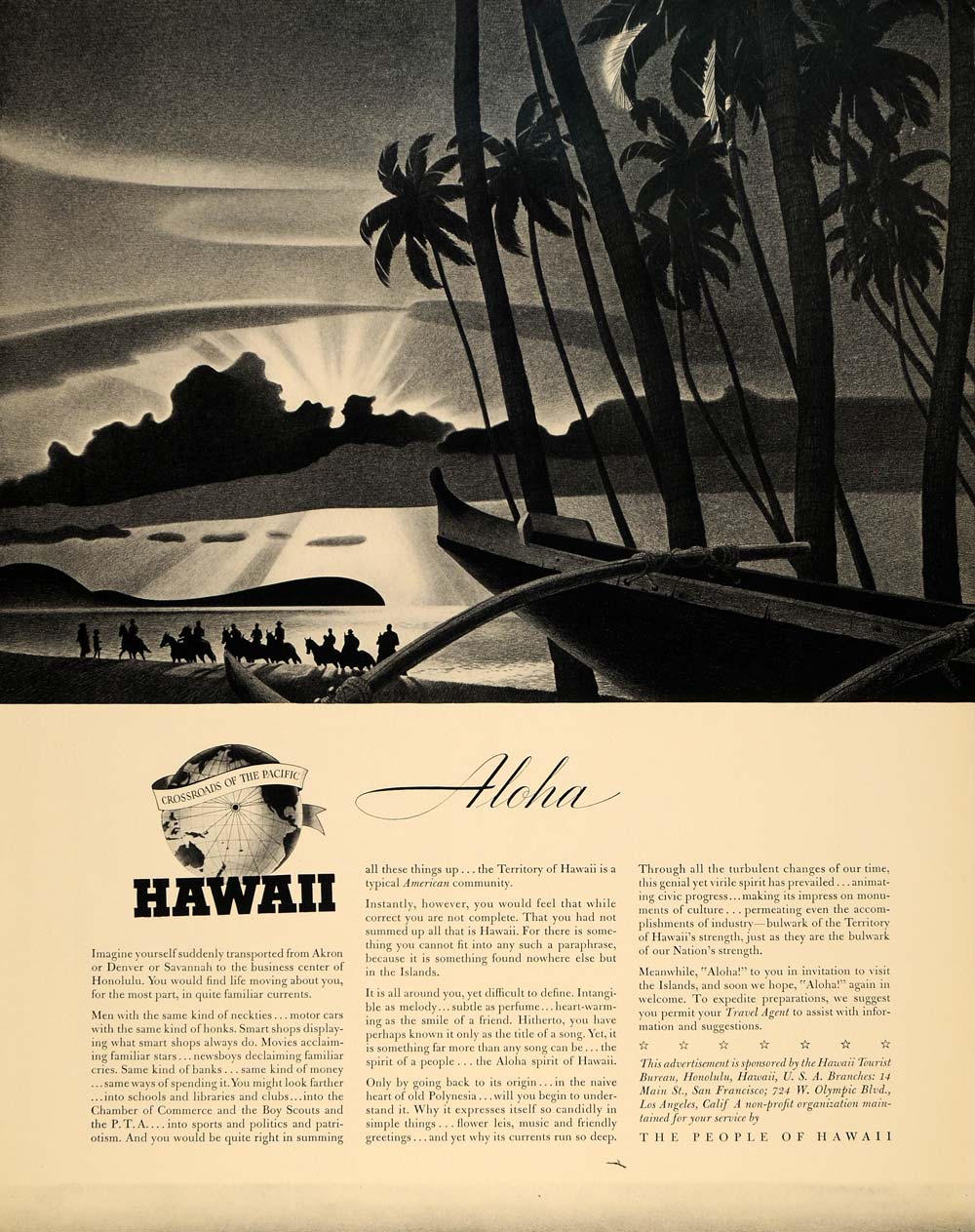 This is an original 1940 black and white print ad for the Hawaii Tourist Bureau, located in Honolulu, Hawaii, and with United States branches at 14 Main Street in San Francisco, and 724 W. Olympic Boulevard in Los Angeles.