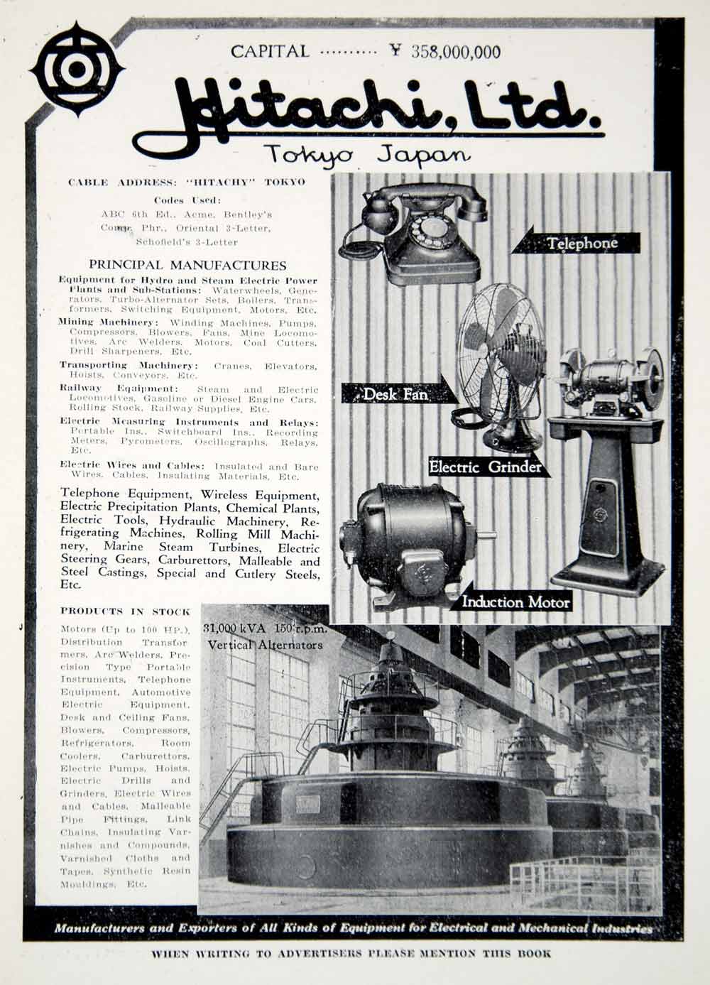 This is an original 1940 black and white print ad for Hitachi, Ltd. of Tokyo, Japan, manufacturers and exporters of all kinds of equipment for electrical and mechanical industries including the telephone, desk fan, electric grinder, induction motor, and vertical alternators shown here.