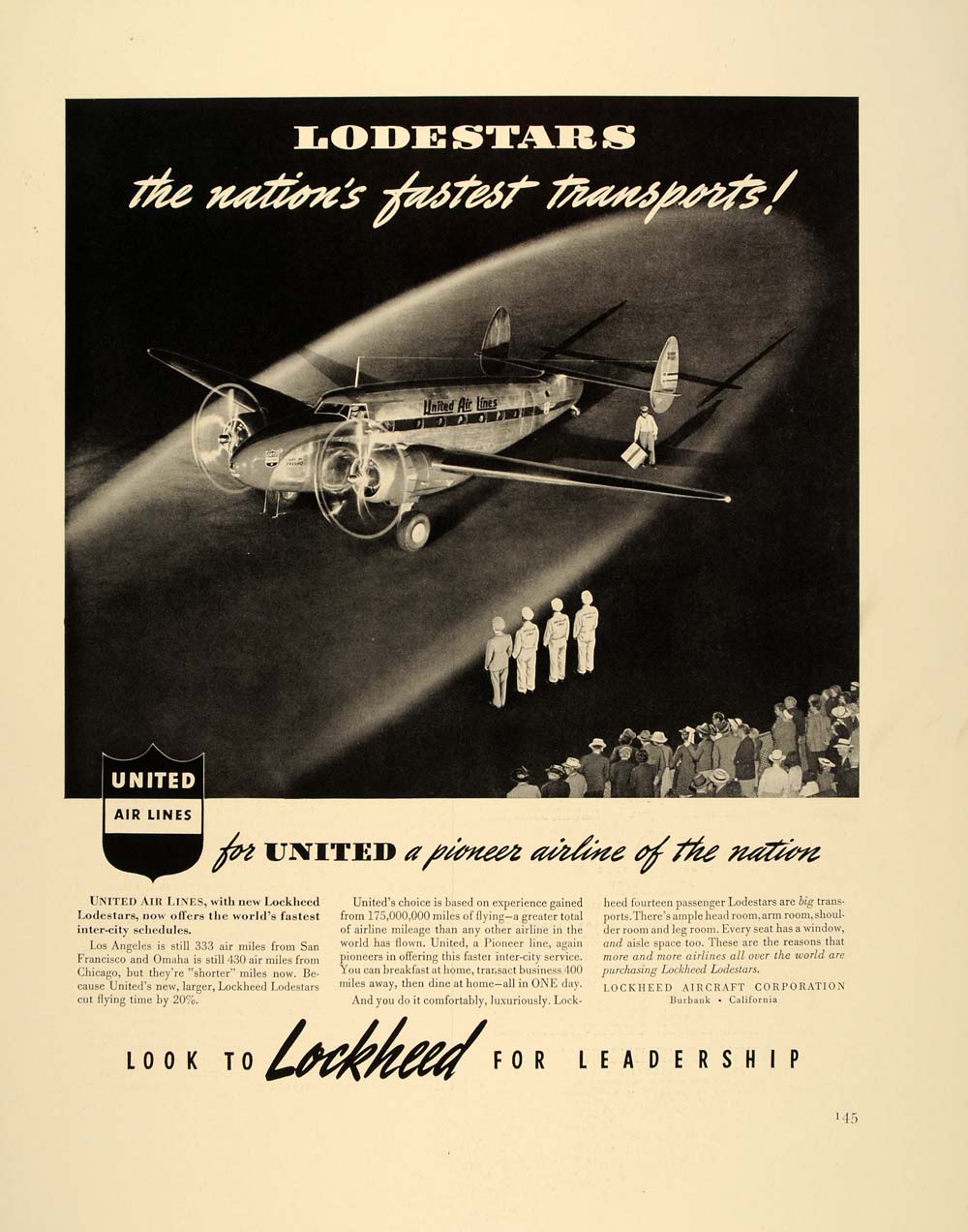 This is an original 1940 black and white print ad for the new Lockheed Lodestars used by United Air Lines, from the Lockheed Aircraft Corporation.