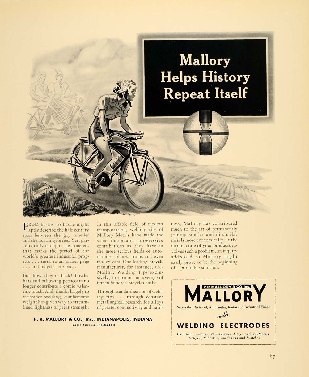 This is an original 1940 black and white print ad for the Mallory welding electrodes from P. R. Mallory & Company, Incorporation, serves the electrical, automotive, radio and industrial fields located in Indianapolis, Indiana.