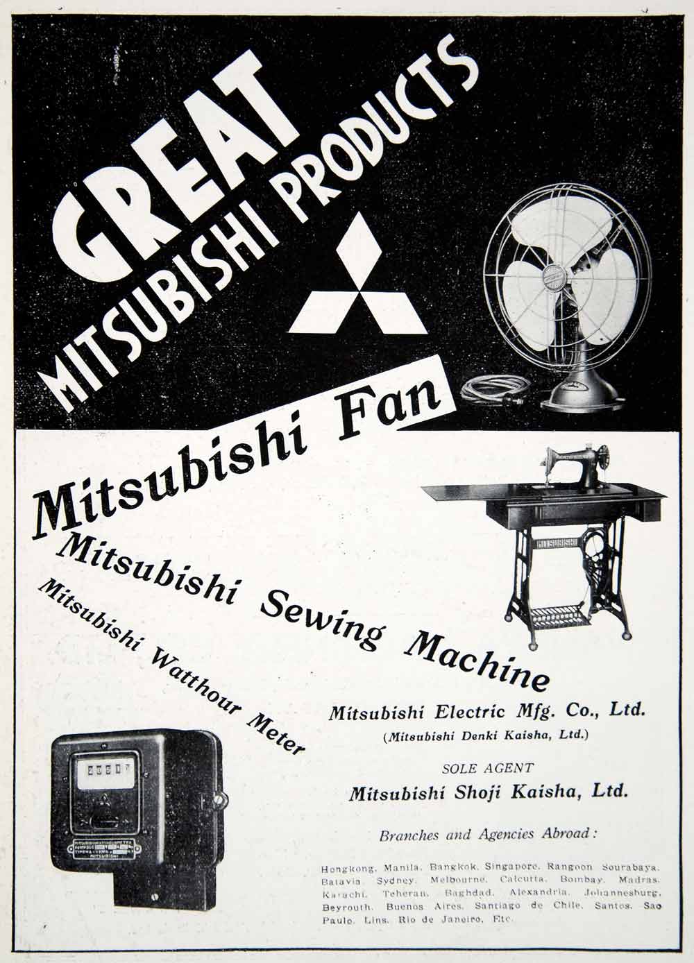 This is an original 1940 black and white print ad for Mitsubishi electrical products: Fan, Sewing Machine, and Watthour Meter, from the Mitsubishi Electric Mfg. Co., Ltd. (Mitsubishi Denki Kaisha).