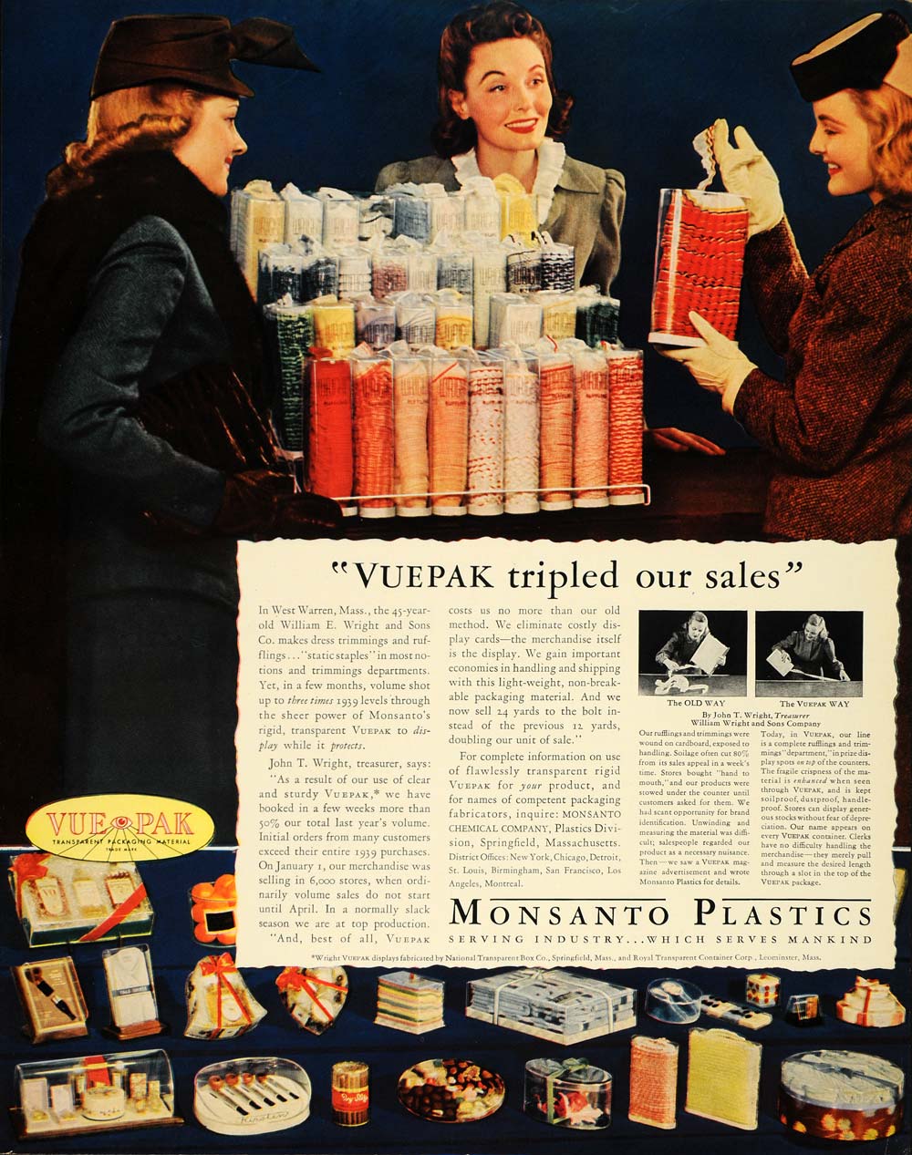 This is an original 1940 color print ad for the Monsanto Chemical Company Plastics Division, located in Springfield, Massachusetts. This ad features their Vuepak transparent packaging material.